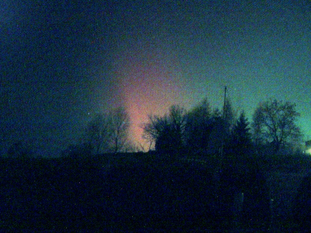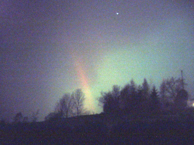 Am Abend des 20.11.2003 waren unter anderem diese Nordlichter über Gelenau sichtbar. Leider ist an unserem Standort die Sicht in nördliche Richtung durch den Kegelsberg sehr eingeschränkt. Für die Aufnahmen stand nur eine nicht sehr empfindliche Digitalkamera mit zu kurzer Belichtungszeit zur Verfügung, deshalb sind die Fotos etwas unscharf. Die schönsten Erscheinungen, die sich über den gesamten Himmel zogen, waren leider nicht aufzunehmen, da kein Weitwinkelobjektiv zur Verfügung stand. Zwischen 18 und 22 Uhr war zeitweise die gesamte nördliche Himmelshälfte in ein zartes grünes Leuchten getaucht, in dem grüne und rote Bänder auftauchten und vergingen. Das letzte mal gab es so etwas bei uns vor 25 Jahren und die Erscheinung war damals wesentlich unscheinbarer. In the evening of Nov-20-2003 many aurorae appeared at the nightsky over Gelenau. As you see - unfortunately there is a mountain in the north of us, so we were not able to see the whoole scenery. From 6 to 10 pm the whole northern half of the sky showed a smooth green glow with red and green wizards dancing in it. The images are a little unsharp, because we took a digital camera with a weak optic and sensity. Last time such a phenomena appeared 25 years ago at our location and it was much weaker. |